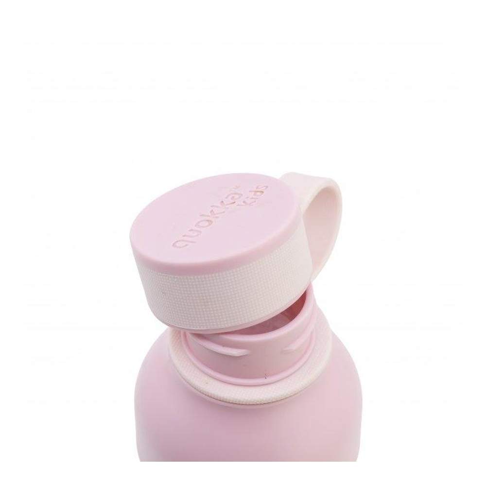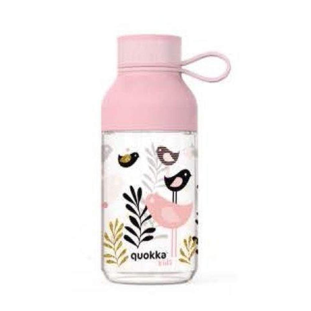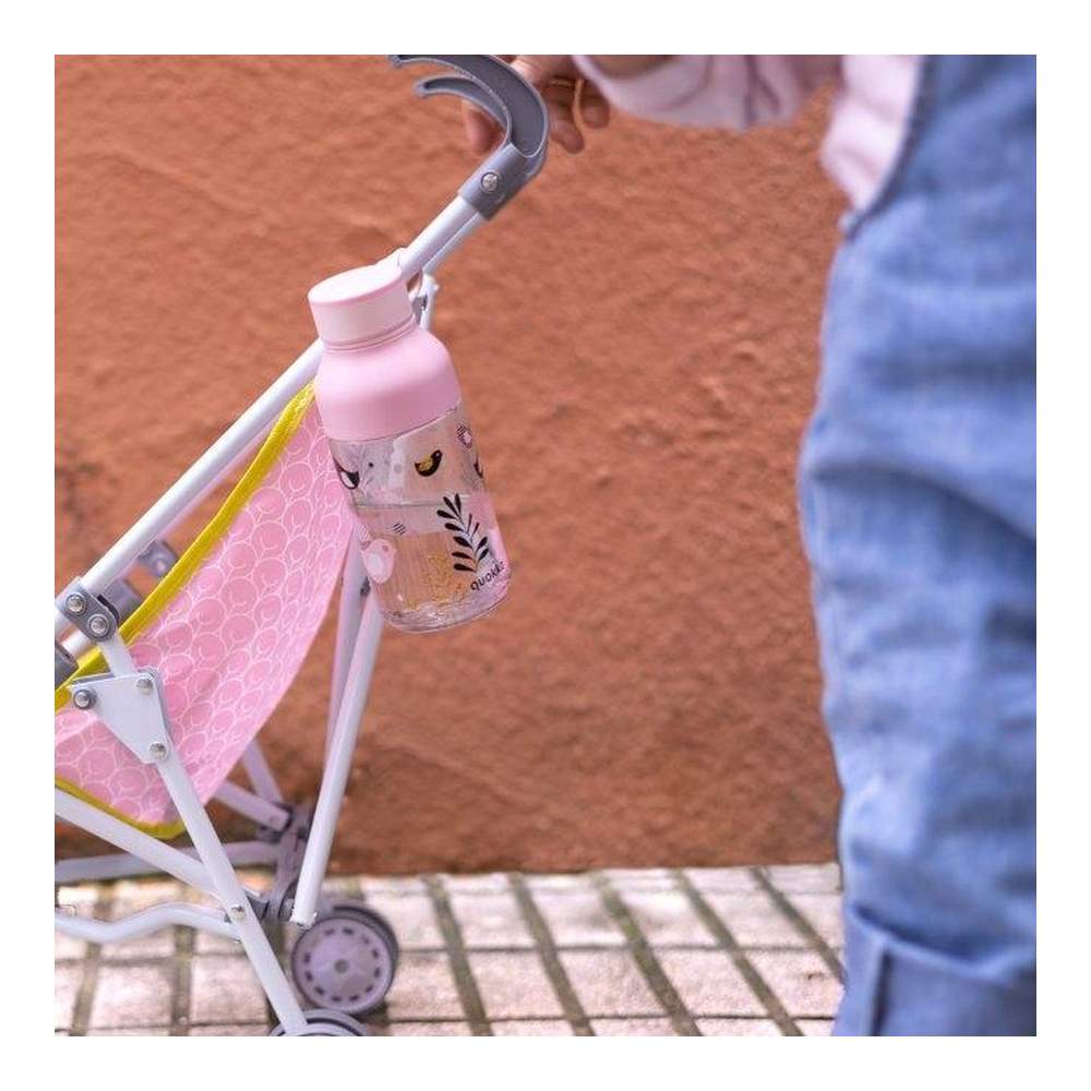 Botella para los más pequeños, con asa para un facil transporte, puedes colgarla de cualquier parte, y con una capacidad de 430 ml.Diseño de Quokka con motivos de pajaritos en color rosa.