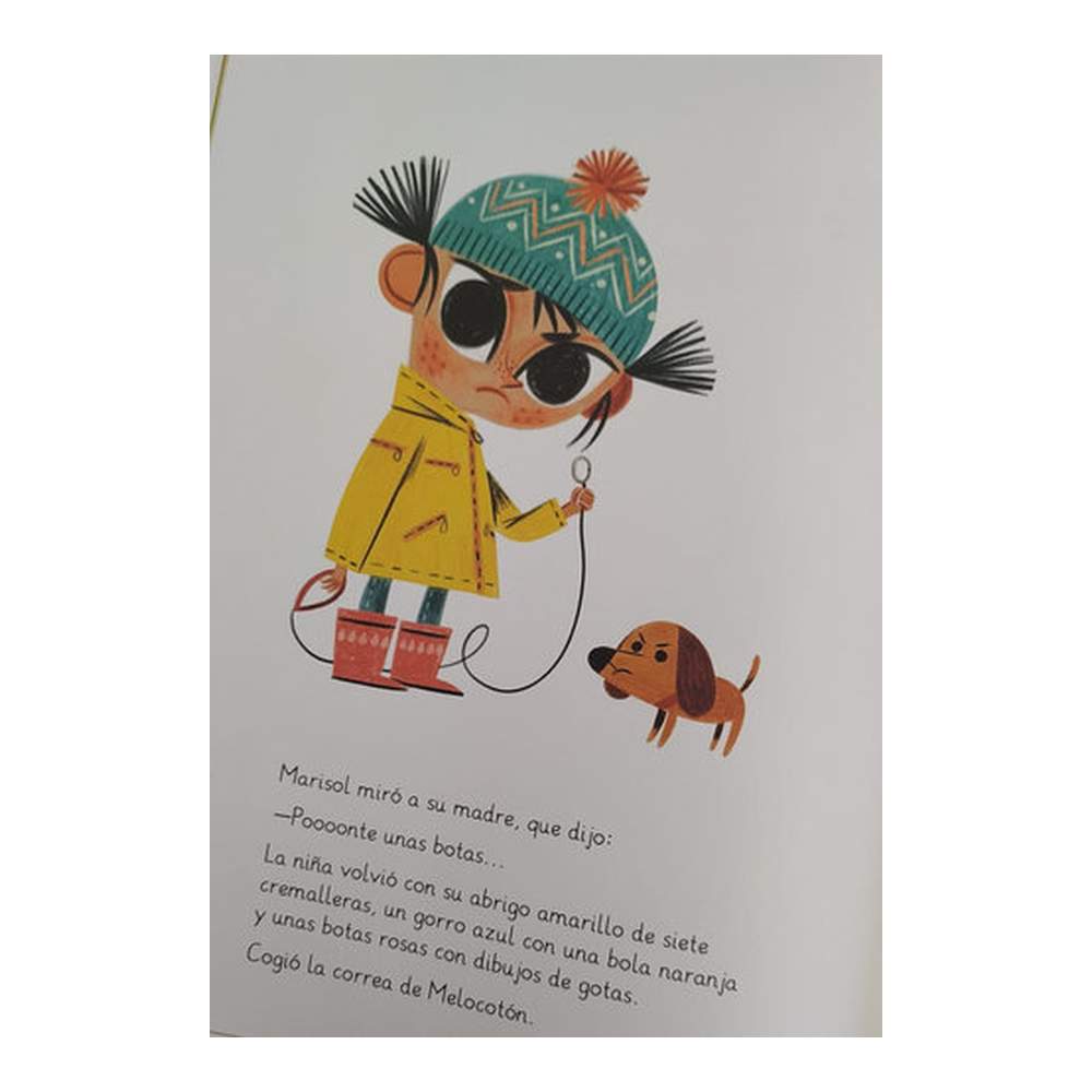 Marisol quiere salir a pasear con su perro Melocotón. Cuando se prepara para salir de casa, su padre, hombre sensato y precavido, le hará abrigarse ante la inminente la lluvia. Una divertida historia acumulativa que nos habla de cuán sobreprotectores son a veces los padres.