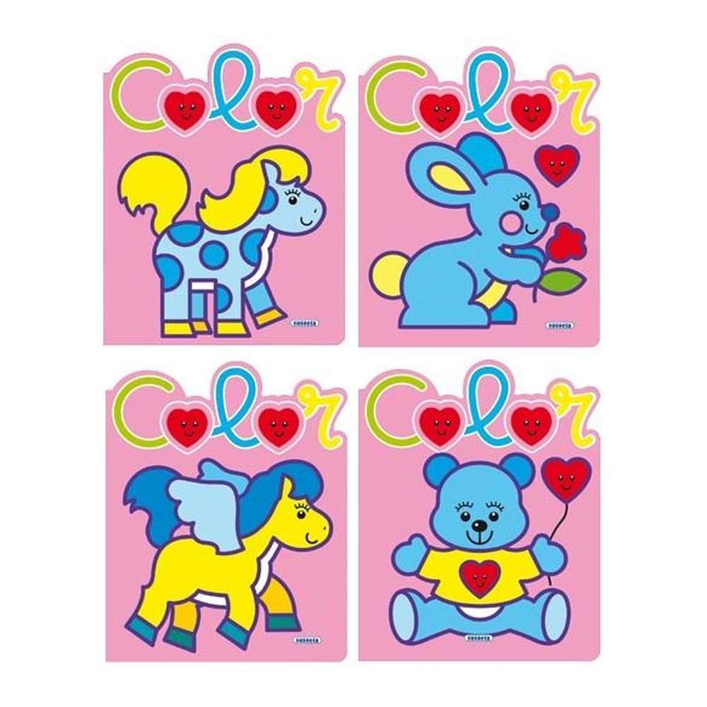 Esta colección de cuatro libros contiene encantadores dibujos de trazo grueso y colores primarios. Hadas, animales, flores, castillos, todo un universo mágico para que los niños se diviertan coloreando.
