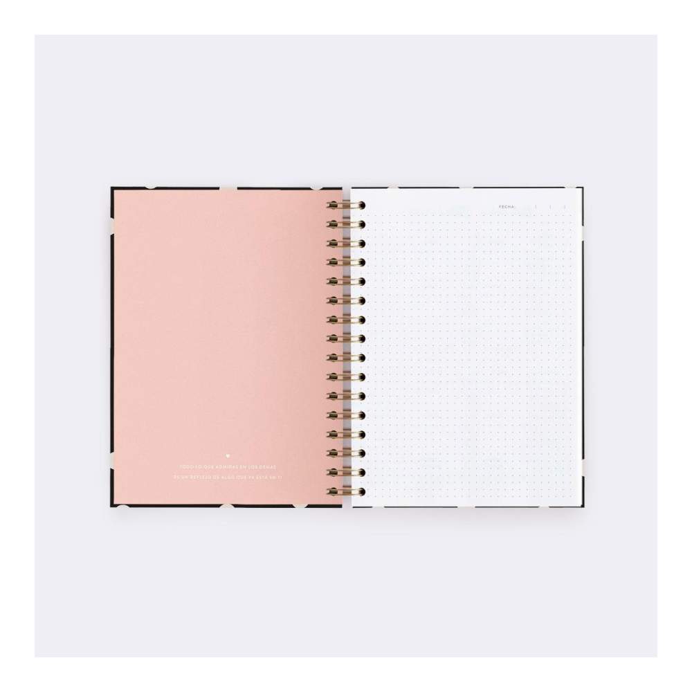 Cuaderno en tamaño A5. Pégale tickets, fotos y recuerdos y se convertirá en tu diario. El interior es de puntitos, la impresión es suave para que puedas utilizarlo para escribir o dibujar.
