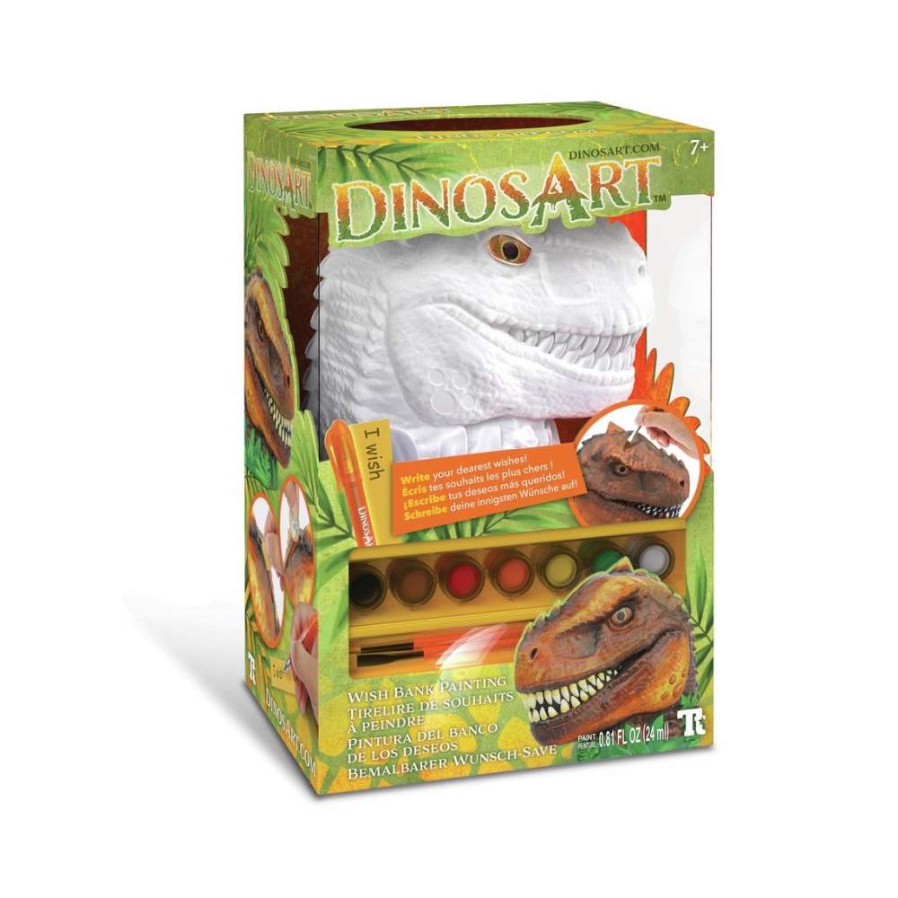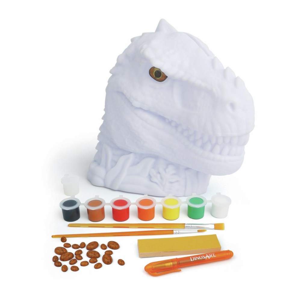Hucha en forma de cabeza de T-REX personalizable con pinturas para darle color a tu gusto.Incluye 7 pinturas acrílicas, 2 pinceles de diferentes tamaños y un mini bolígrafo de gel y un bloc de notas.