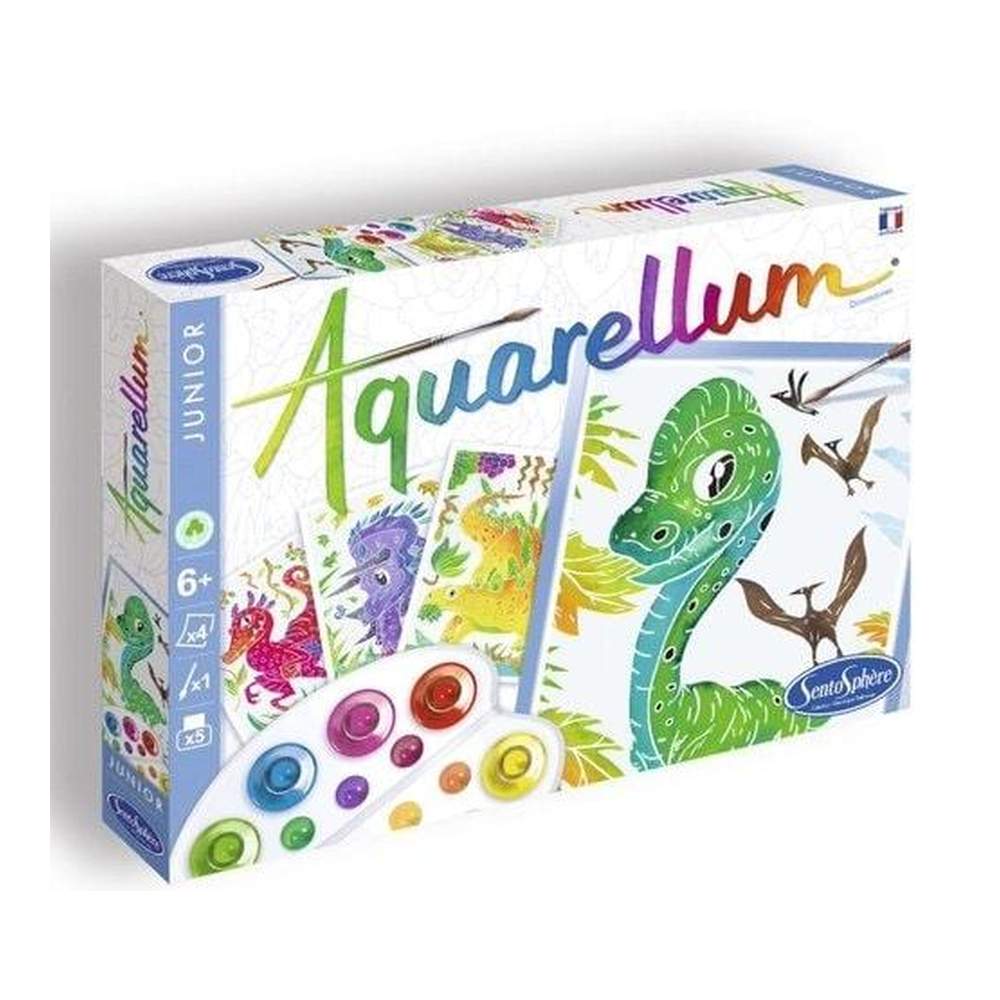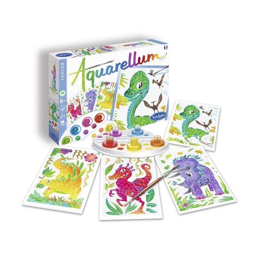 A partir de 6 años.íSi le gustan los dinosaurios le encantará pintar estos 4 increíbles reptiles! Solo con un par de gotas de pintura, serán capaces de crear verdaderas obras de arte. Aquarellum Junior es una técnica de pintura que permite que las personas de todas las edades sean capaces de crear verdaderas obras de arte. Aquarellum es una actividad creativa que, además de ser muy divertida, es perfecta para aprender las propiedades de los colores. Es inicia en el arte de la pintura y de la mezcla de colores, ayudándoles a mejorar su capacidad de concentración.