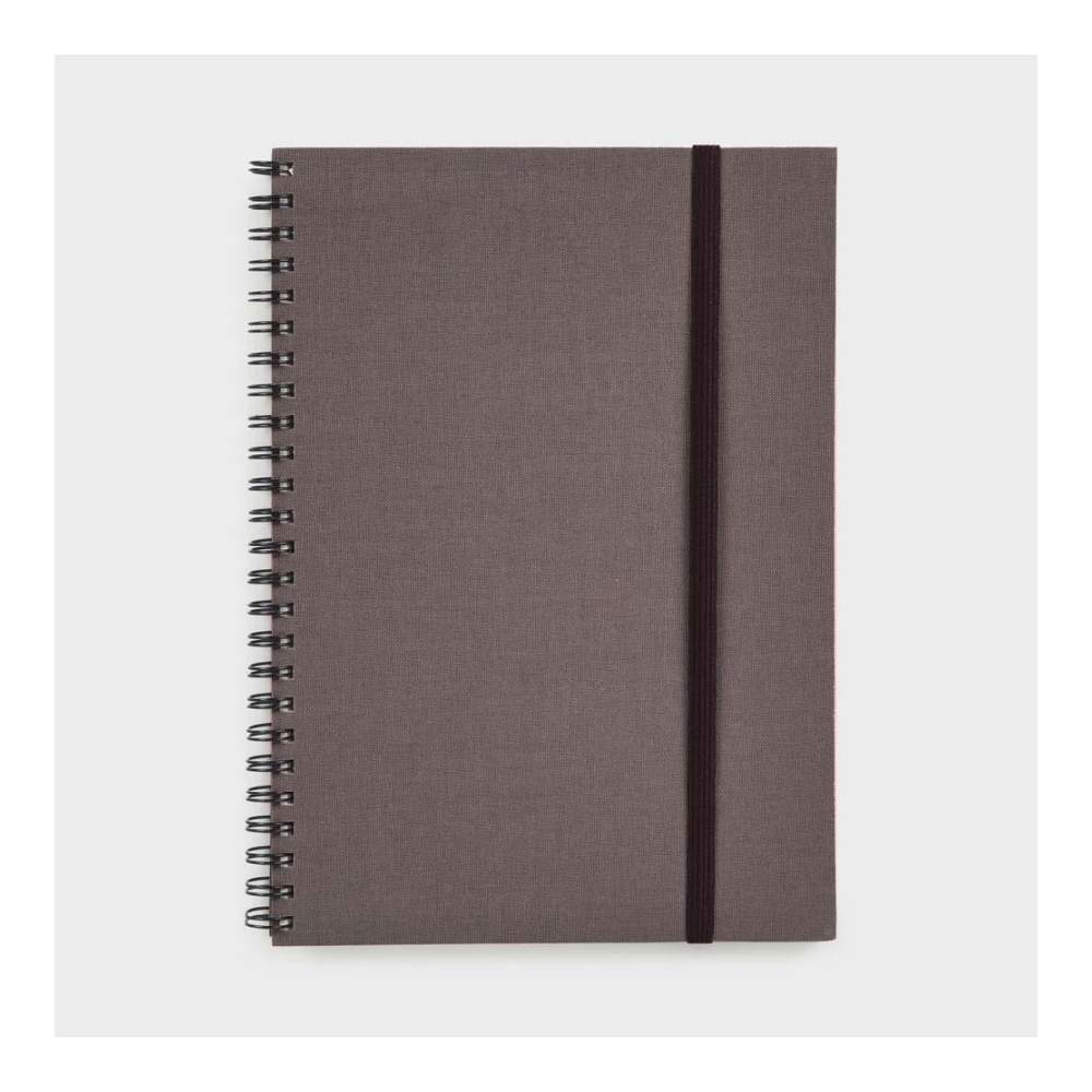Libreta tamaño A5 con encuadernación en espiral, tapas forradas en tela y cierre de goma. Interior de hojas cuadriculadas. Ligera y elegante.