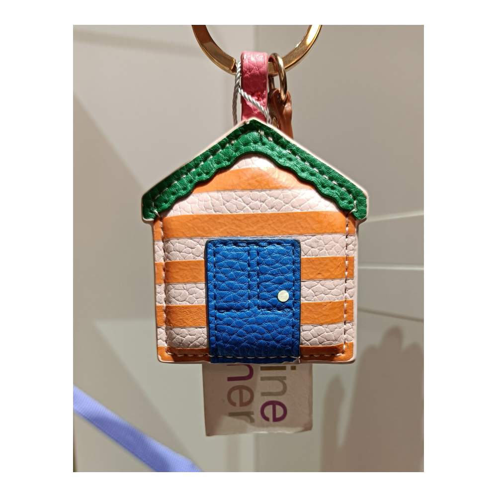 Llavero en forma de casita en tonos llamativos con herrajes dorados.