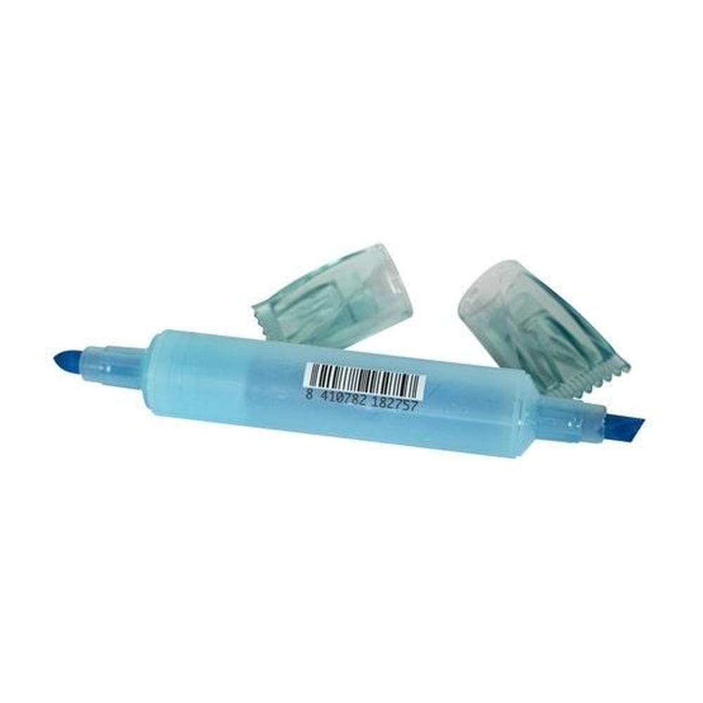 Subrayadores azules en forma de caramelo. De doble punta: plana de 5mm y redonda de 2 mm. Ideales para subrayar, marcar y escribir textos destacados en agendas, libretas y calendarios.