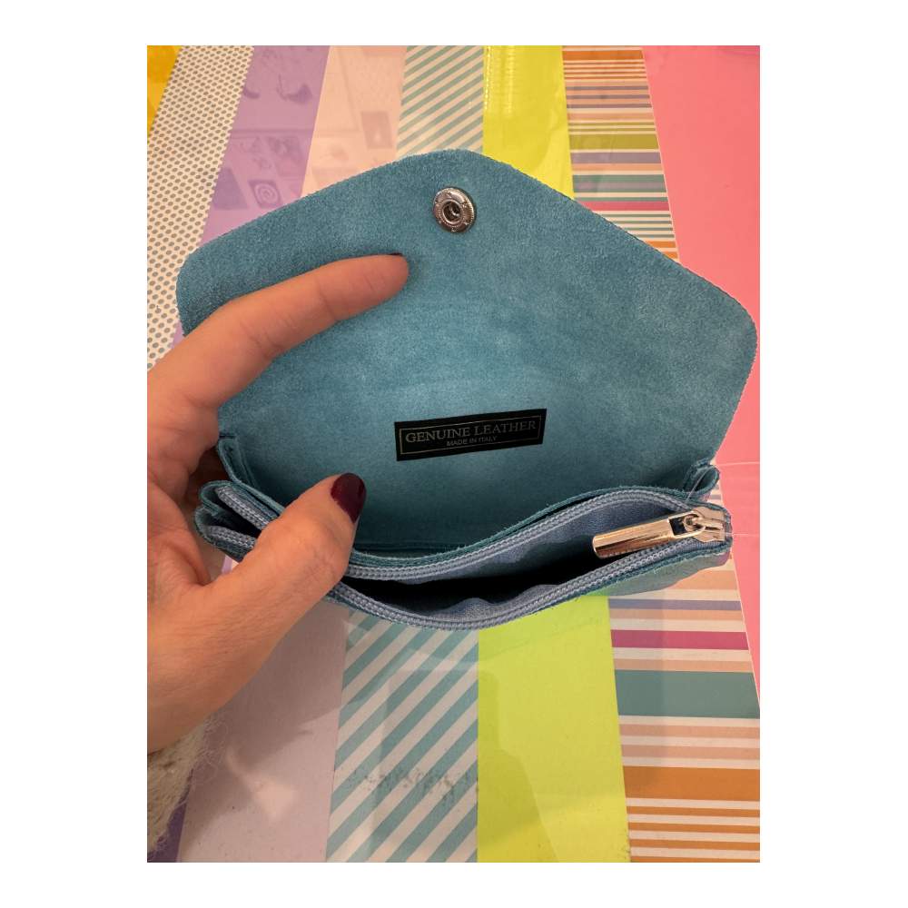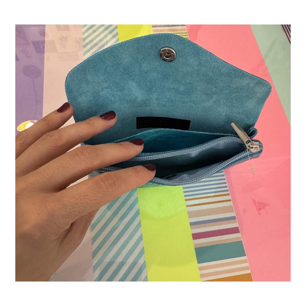 Monedero grande de piel iridiscente brillante con cierre de botón a presión.