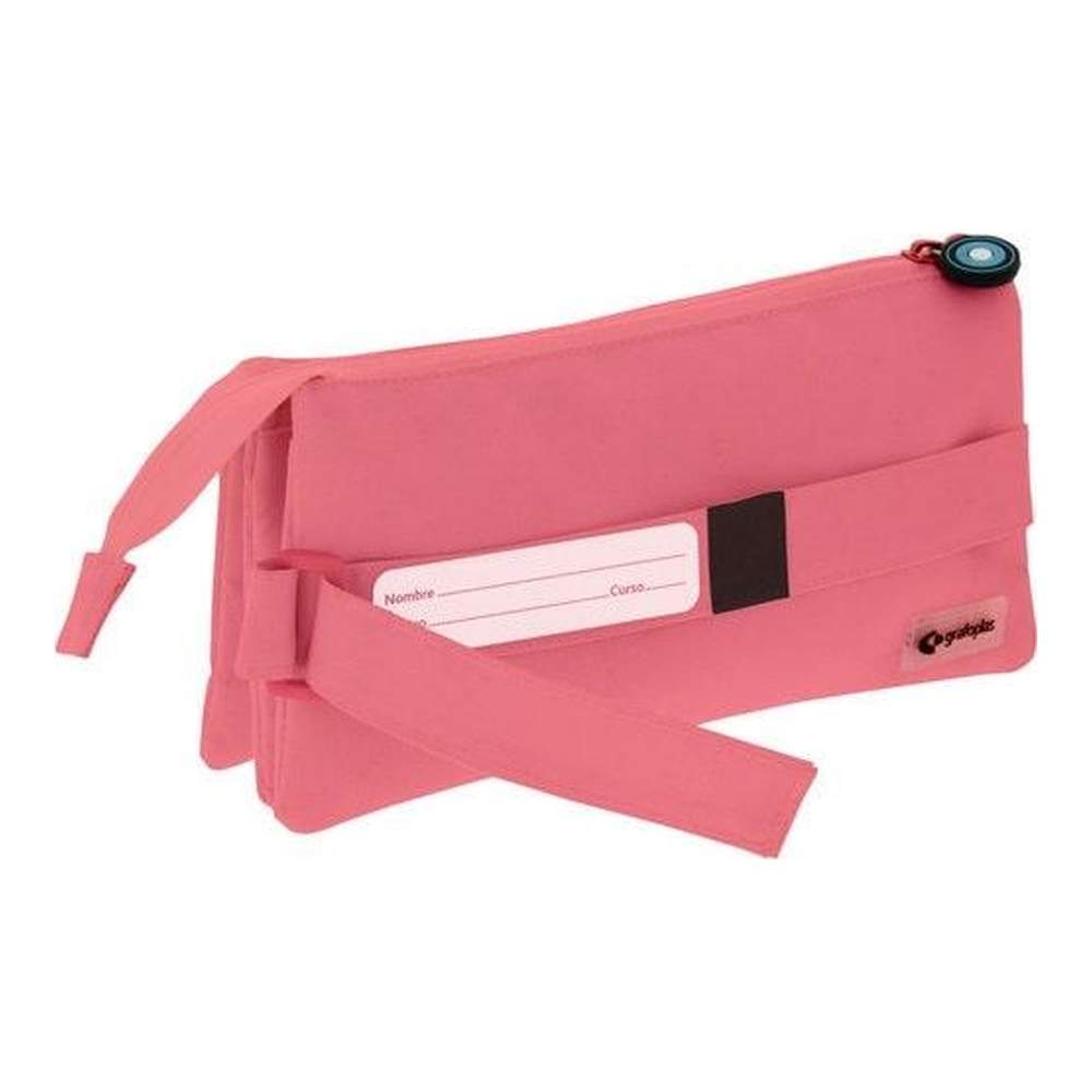 Estuche de triple capacidad y forma triangular plano de color rosa.