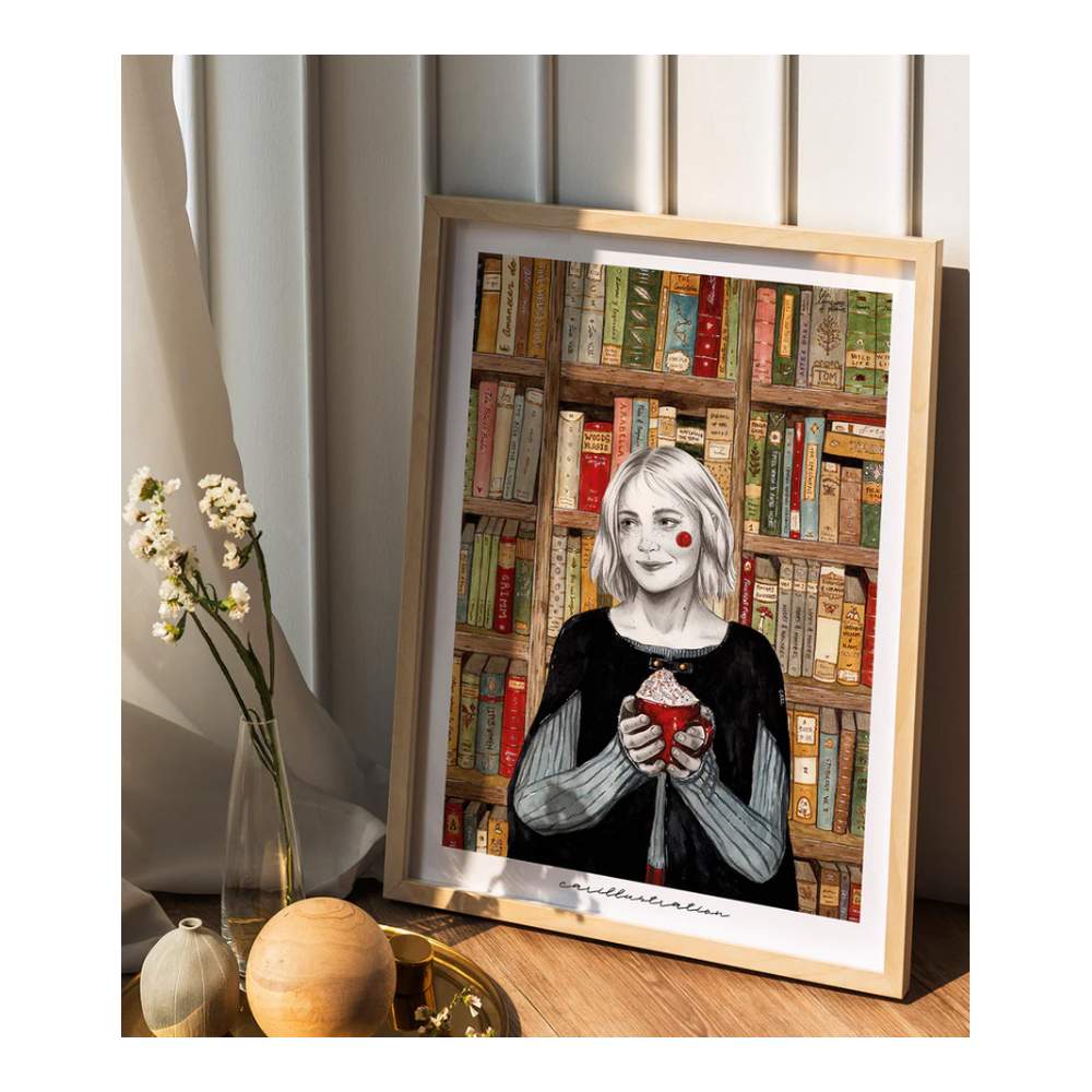 Lámina impresa tamaño A4, titulada ‘Cozy bookshop’, de Cari. Holly (nombre elegido por votación por las seguidoras de Instagram de la ilustradora) disfruta de un espumoso café en una bella tarde de otoño en su lugar favorito: la librería.