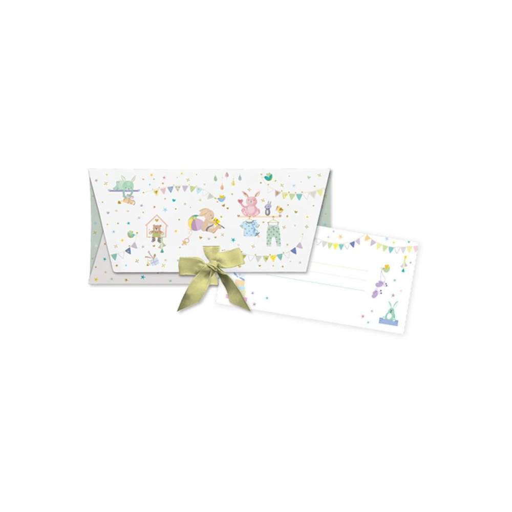 Sobre para regalo con lazo y tarjeta con motivos de bebés.