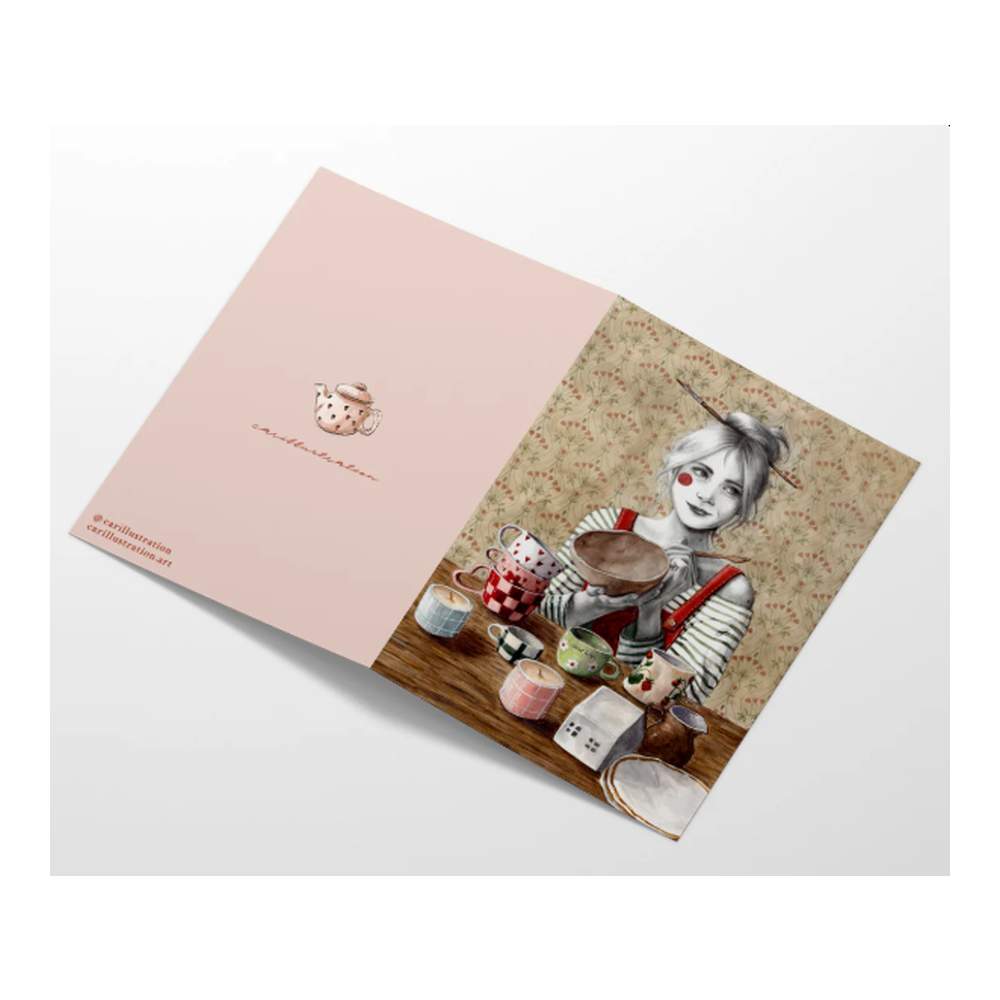 Una tarjeta alegre y divertida de alta calidad confeccionada a partir de una ilustración realizada a mano a lápiz y acuarela. Sin duda a las amantes de la cerámica y la artesanía os encantará.