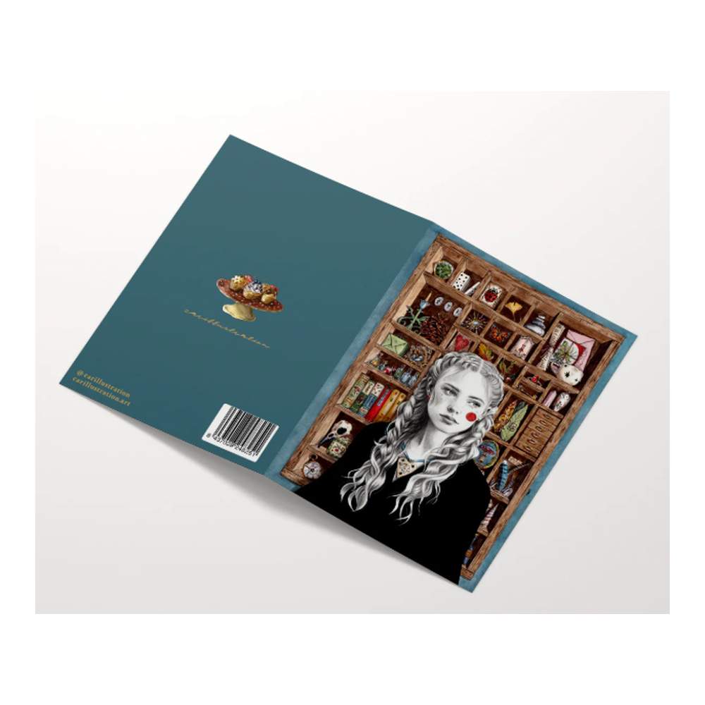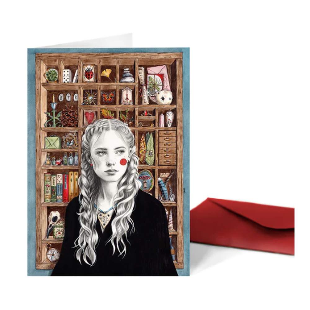 Esta preciosa tarjeta ilustrada representa a una misteriosa peliblanca frente a un armarito vintage en el que recolecta y colecciona toda suerte de tesorillos naturales: plumas, huesos, frasquitos, plantas, piedras, nidos… ¡Qué especial en todos sus minuciosos detalles!