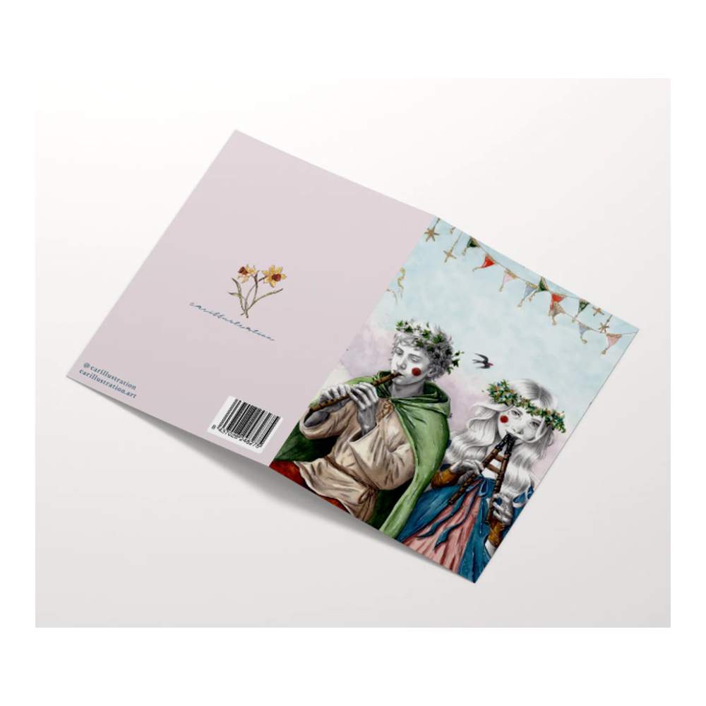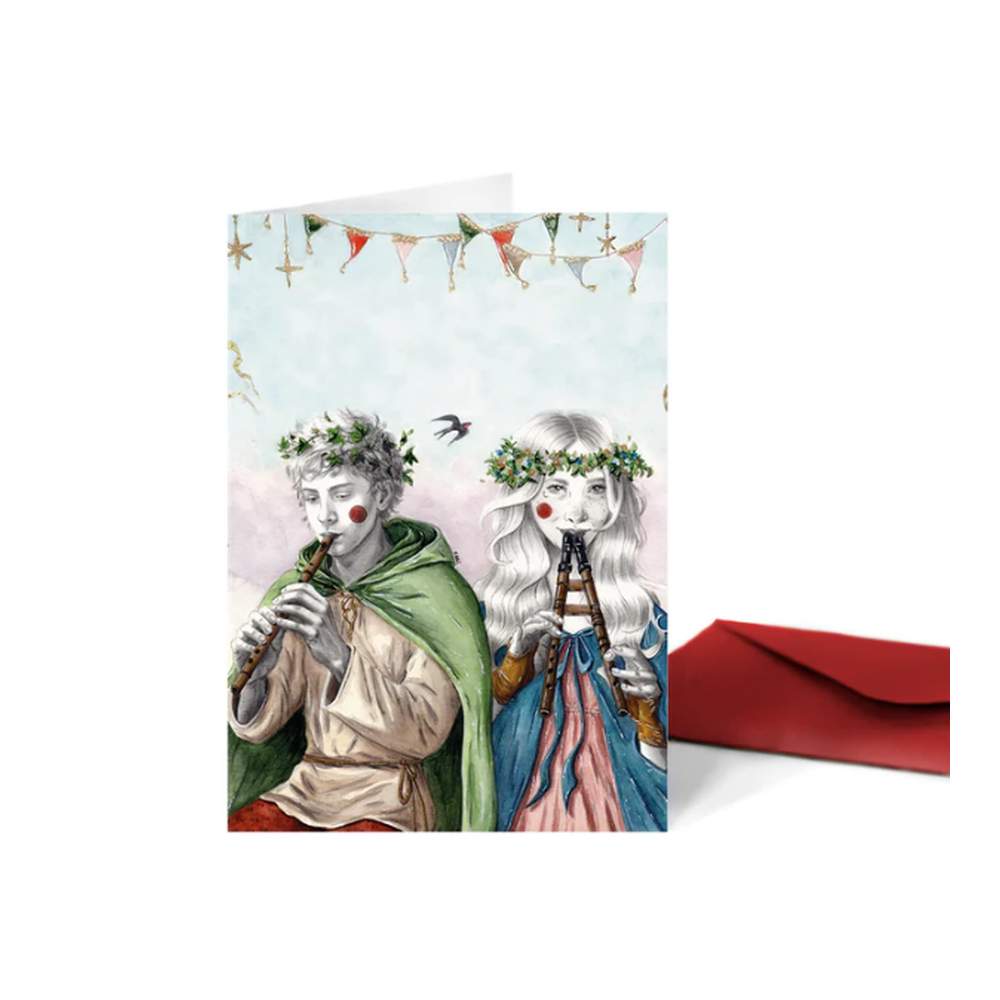 Esta preciosa tarjeta ilustrada está inspirada en los festivales y ferias medievales en los que los banderines de colores, disfraces y música llenan de alegría y jolgorio el ambiente. Un chico y una chica tocan suaves melodías en flautas de madera.