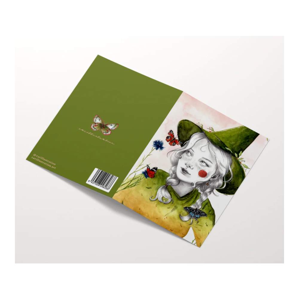 Esta preciosa tarjeta ilustrada representa a a una joven brujita primaveral que siente una poderosa afinidad con la naturaleza: plantas, flores, hierbas, mariposas…